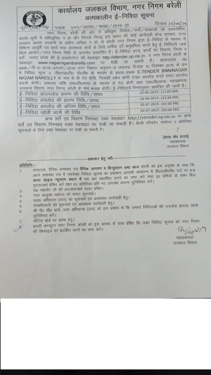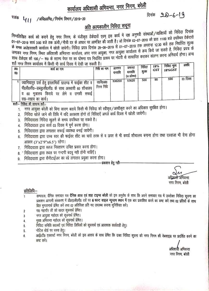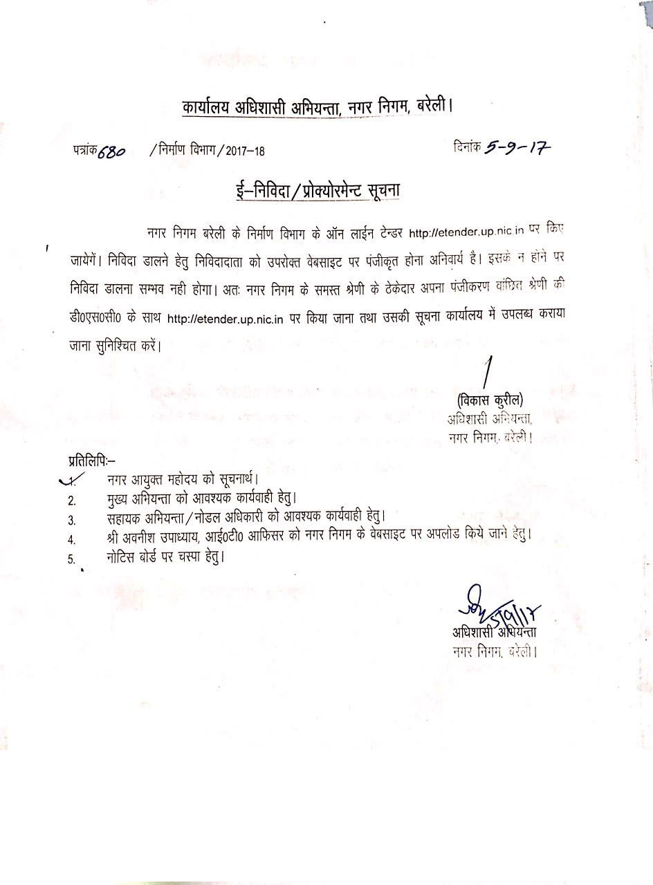 | 3. | 08-04-2025 | पत्रांक-03/मु0अभि0/नि0वि0/2024-25 E-Tender Notice In compliance with Government Order सं0-3890/नौ-5-149सा/2019 Urban Development Section-05, Government of Uttar Pradesh, Lucknow dated 20 September 2019, tenders for construction works from contractors are invited through two bid method (technical and financial) in the following manner. | Download |
